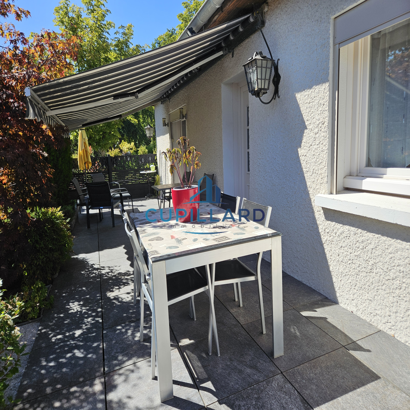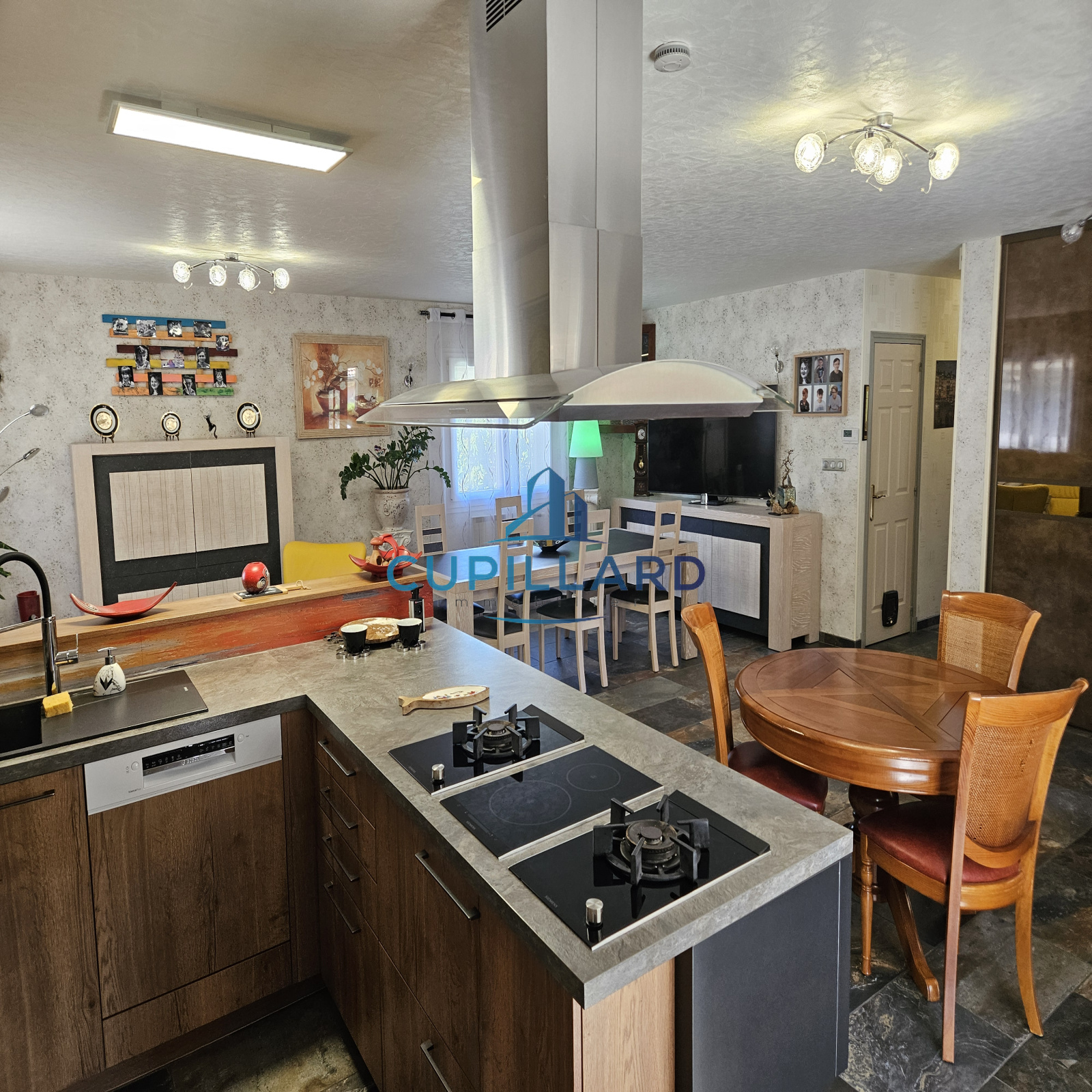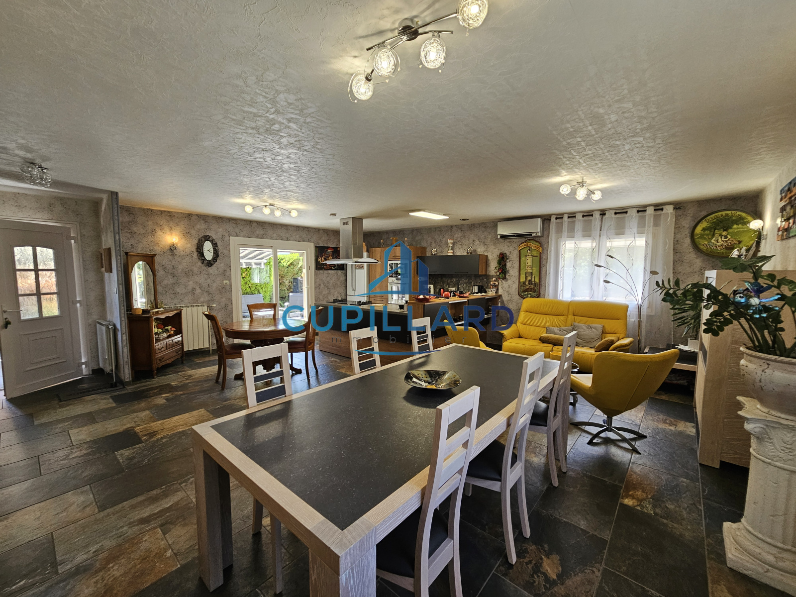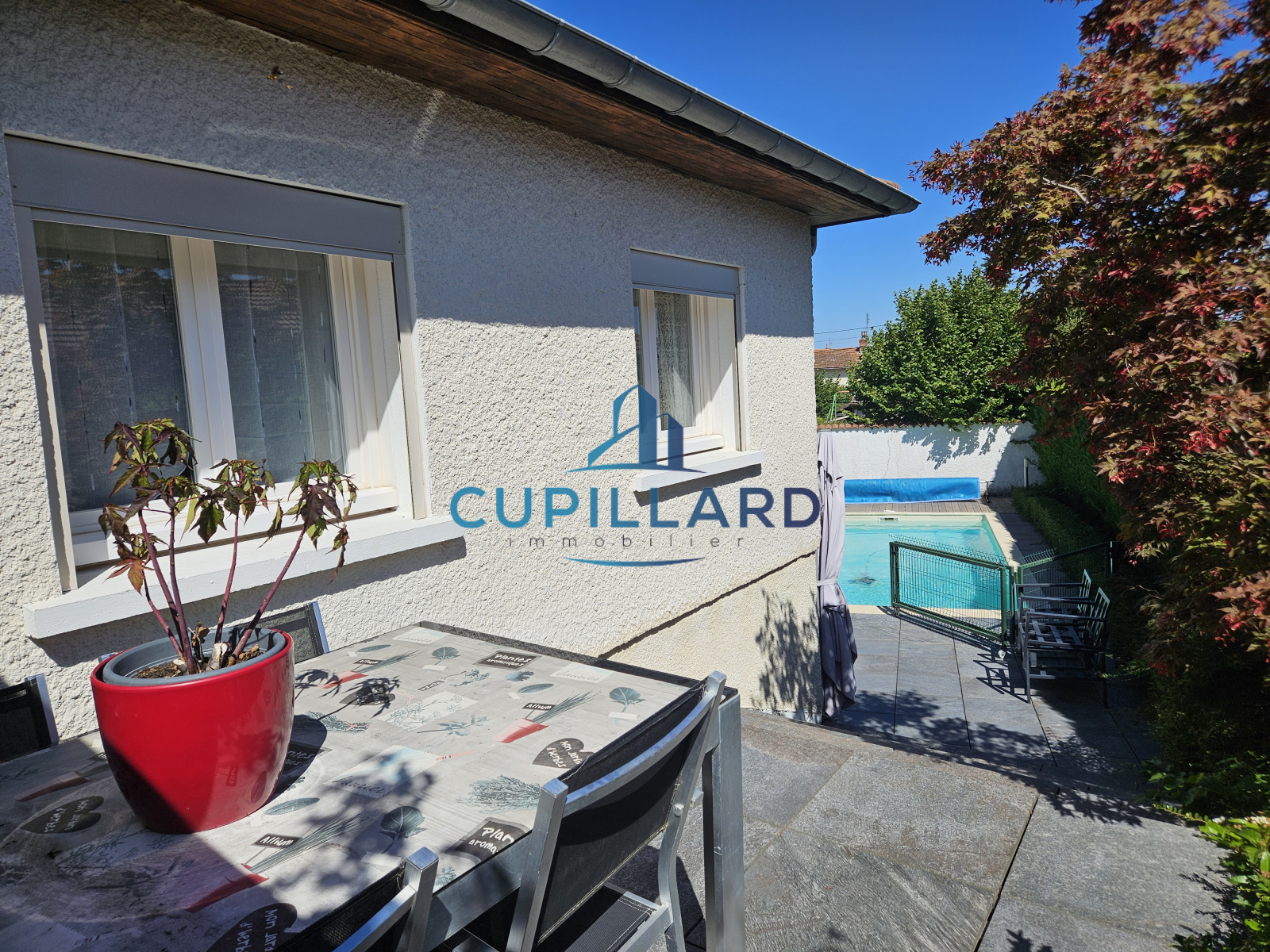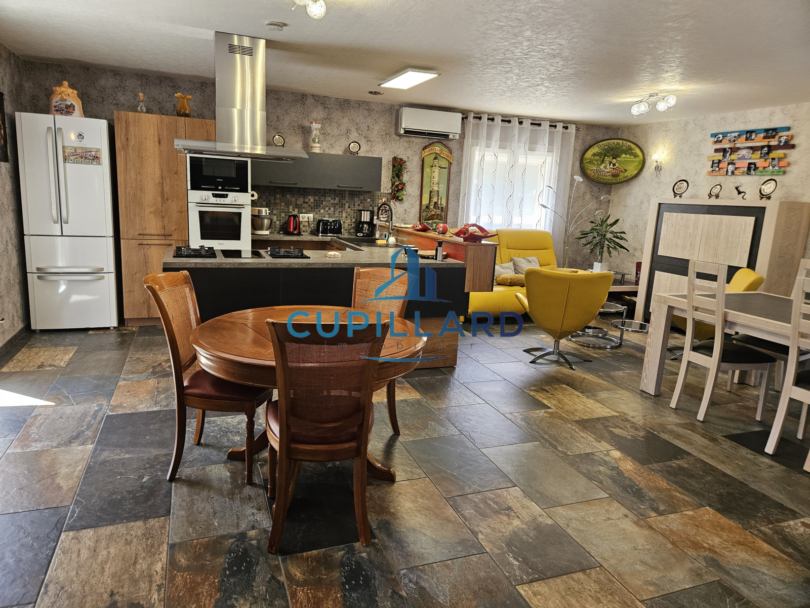 MABLY Bourg, maison de 1980 entièrement rénovée (cuisine, SDE, huisseries, clim réversible) avec grande pièce de vie, trois chambres, salle d'eau et wc. Double garage, buanderie, atelier et cave. Terrasse carrelée sur plots tout autour de la maison .